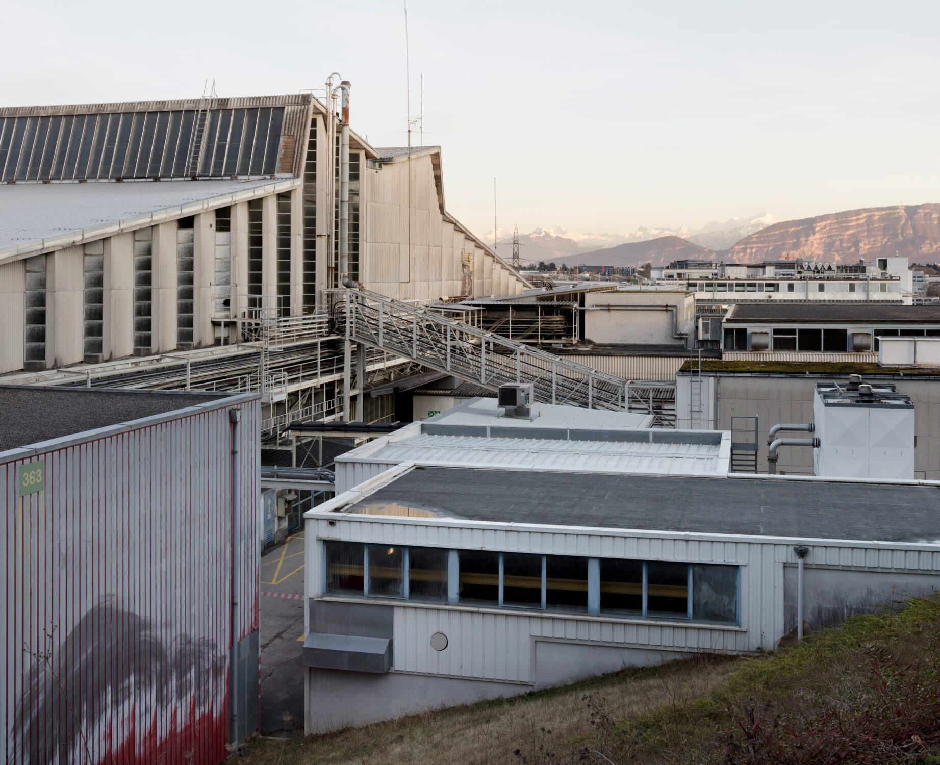 On the second to last day of a research visit at CERN, there was some spare time in the schedule. I took a long walk towards building 282 in search of some excavation samples: cylindrical pieces of rock that were preserved when the tunnel was dug, glued to a block of wood and frequently exhibited in museums over the last three decades as material evidence of the earthwork and as a witness to the depth. The route led me along the back of building 363 where the wind caused young trees – now gone – to scuff the facade over time.